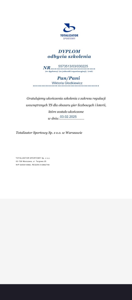 Zdobyty certyfikat totalizatora sportowego 2024 r.
