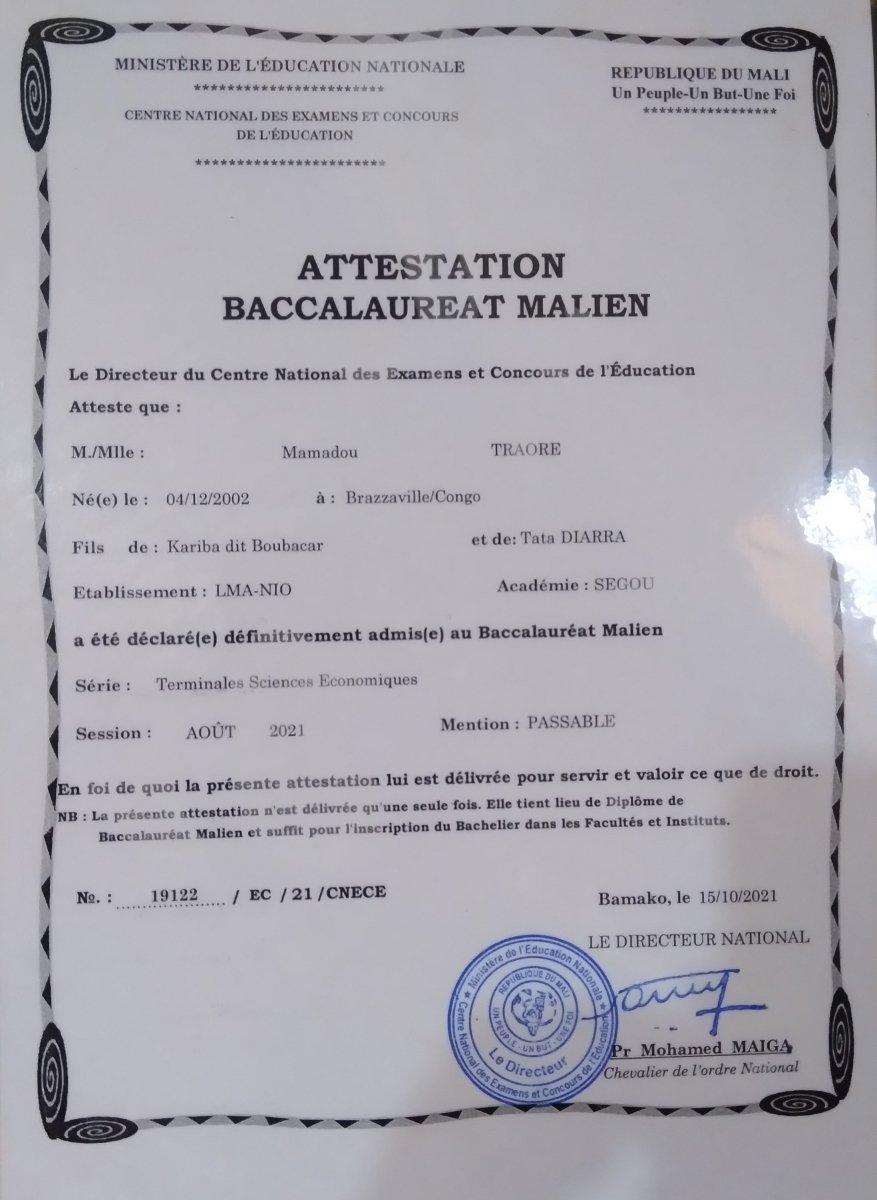 Je suis actuellement inscrit à l'Université des Sciences Sociales et de Gestion de Bamako (IUG), où je poursuis des études en informatique de gestion pour l'année universitaire 2024-2025. Mon inscription est confirmée par le versement des droits d'inscription.