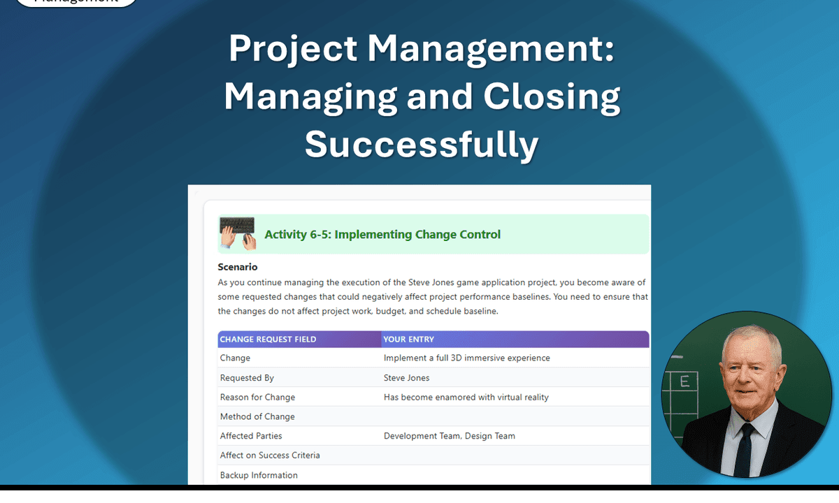 To round out your data-analysis skills in project management, you'll manage a project by beginning work, executing the plan, tracking progress, reporting performance, and implementing change control. You'll also close various projects and project elements like sprints, releases, adaptive projects, and predictive projects. Lastly, you'll create a final report.