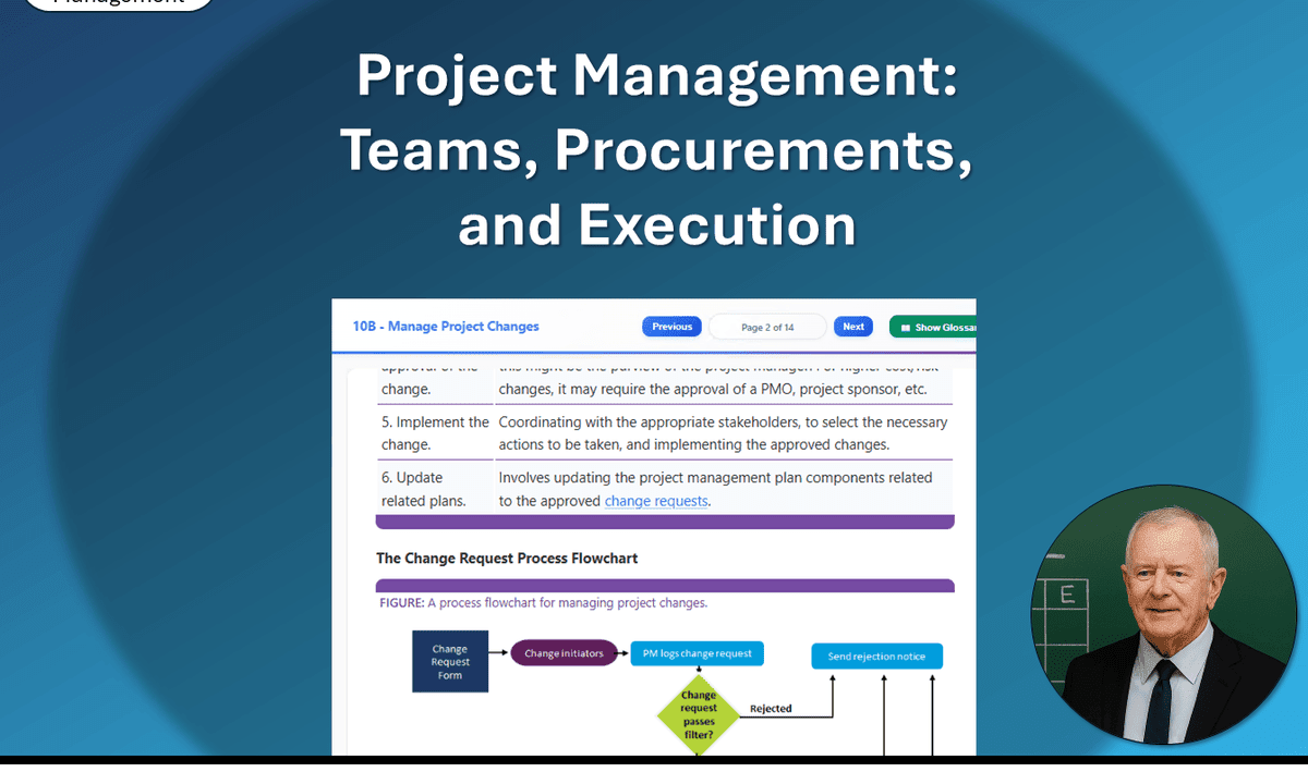 In this course, you'll continue developing your project management skills by planning your project team, assembling the team, developing the team, and handling conflicts within the team. You'll also plan for project procurements, obtain responses from vendors, and manage vendors. Then, you'll prepare for project execution, manage project changes, and monitor the project scope.