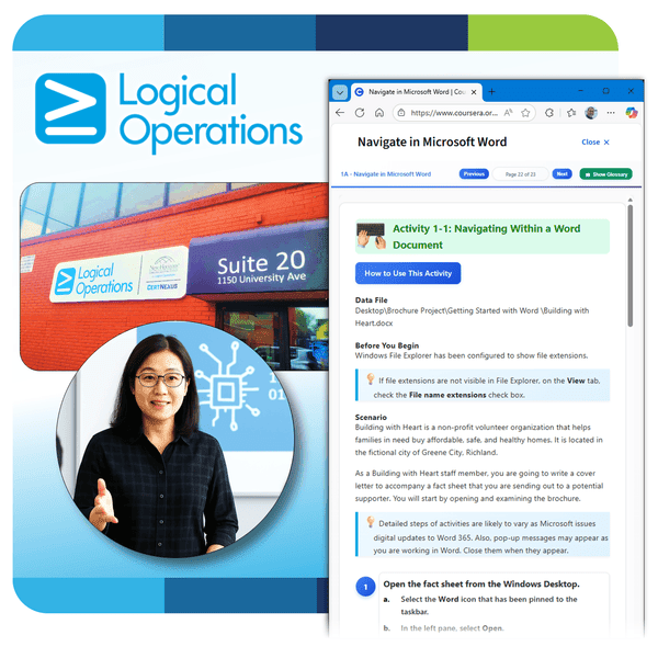 After you master the basics of using Microsoft® Word such as creating, editing, and saving documents; navigating through a document; and printing, you're ready to move on to tackling the more advanced features. These features enable you to create complex and professional documents with a consistent look and feel. They also enable you to automate tedious tasks such as preparing a letter to send to every customer of your organization. Creating professional-looking documents can help you give your organization a competitive edge. Implementing time-saving features such as document templates and automated mailings helps your organization reduce expenses. Mastering these techniques will make you a valued employee in your organization. Note: Most Office users perform the majority of their daily tasks using the desktop version of the Office software, so that is the focus of this training. The course material will also enable you to access and effectively utilize many web-based resources provided with your Microsoft 365 subscription. This includes brief coverage of key skills for using Word for the Web and OneDrive®. Helpful notes throughout the material alert you to cases where the online version of the application may function differently from the primary, desktop version. This course may be a useful component in your preparation for the Microsoft Word (Microsoft 365 Apps): Exam MO-110 and Microsoft Word Expert (Microsoft 365 Apps): Exam MO-111 certification exams. This course is designed for students who wish to use Microsoft Word to create and modify complex documents and use tools that allow them to customize those documents. In this course, you will learn fundamental Word skills. You will: • Organize content using tables and charts. • Customize formats using styles and themes. • Insert content using Quick Parts. • Use templates to automate document formatting. • Control the flow of a document. • Simplify and manage long documents. • Use mail merge to create letters, envelopes, and labels. This course requires that you have Microsoft Word installed on a Windows PC. The course setup instructions provided in the first module of the course go into more detail about the hardware and software requirements.