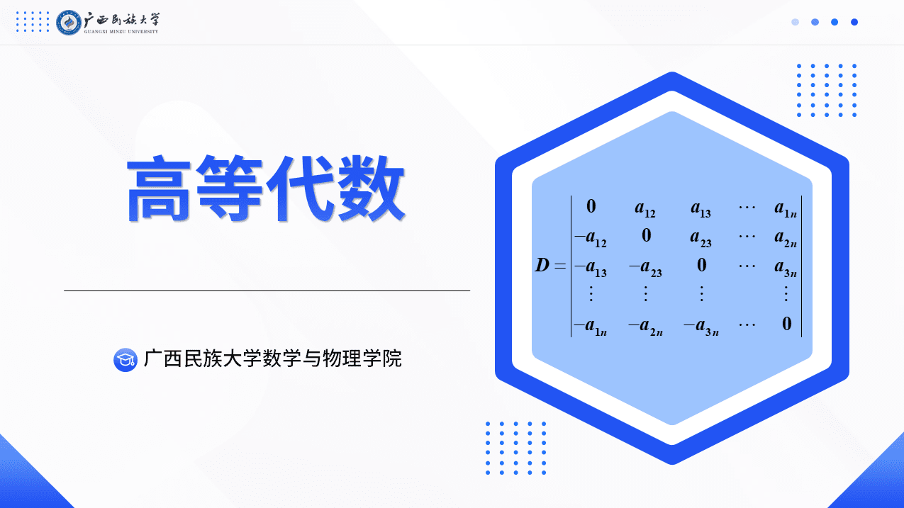 《高等代数》是数学专业的主干基础课程又是数学修养的核心课程,同时也是后续抽象代数、离散数学、计算方法、线性规划等课程学习的基础。旨在培养学生掌握基本知识、基本方法与基本技巧;培养学生抽象思维能力、逻辑推理能力和解决问题的能力等;培养学生的数学修养和内涵,踏实严谨的学习生活习惯以及创新意识和团队协作精神等。