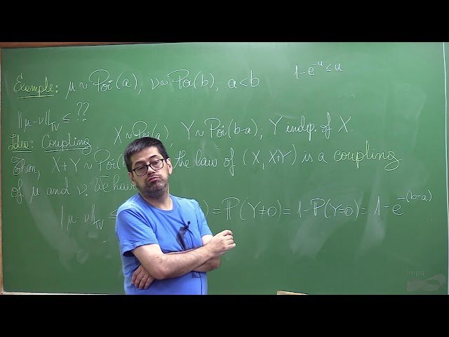 Assista à décima primeira aula do curso de mestrado sobre Cadeias de Markov ministrado pelo Professor Milton Jara no Instituto de Matemática Pura e Aplicada durante a Escola de Verão 2026. Explore conceitos fundamentais da teoria de Cadeias de Markov baseados no livro "Markov Chains and Mixing Times" de Levin, Peres e Wilmer, desenvolvendo conhecimentos essenciais sobre processos estocásticos e suas aplicações em áreas de pesquisa contemporânea. Aprofunde sua compreensão sobre propriedades de convergência, tempos de mistura e comportamento assintótico de cadeias de Markov através de exposição teórica rigorosa e exemplos práticos. Beneficie-se dos pré-requisitos de familiaridade com conceitos elementares de probabilidade e conhecimentos básicos de álgebra linear para acompanhar o desenvolvimento matemático avançado apresentado nesta sequência de aulas que combina fundamentos teóricos sólidos com aplicações modernas da teoria probabilística.