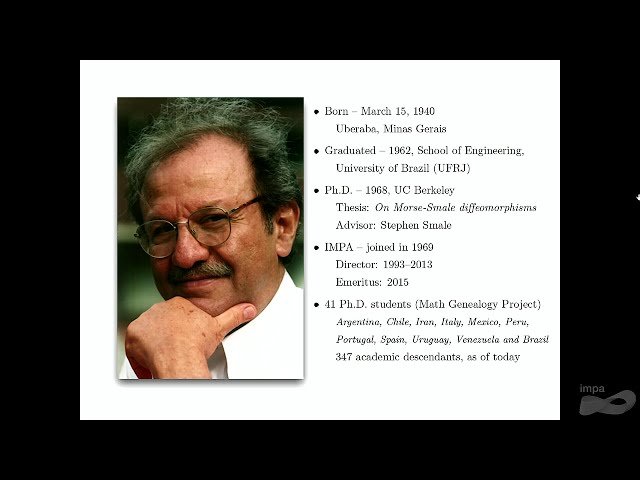 Assista a esta palestra especial de 55 minutos proferida por Marcelo Viana (IMPA) em homenagem a Jacob Palis durante o 35º Colóquio Brasileiro de Matemática. Explore as contribuições fundamentais e o legado científico de Jacob Palis, uma das figuras mais influentes da matemática brasileira, através da perspectiva de um dos principais pesquisadores do IMPA. Descubra como o trabalho pioneiro de Palis em sistemas dinâmicos e teoria ergódica influenciou gerações de matemáticos e moldou o desenvolvimento da matemática no Brasil. Compreenda a importância de suas pesquisas em bifurcações, estabilidade estrutural e teoria dos sistemas dinâmicos, bem como seu papel fundamental na consolidação do IMPA como centro de excelência internacional. Aprenda sobre a trajetória acadêmica de Palis, suas principais descobertas matemáticas e sua contribuição para a formação de uma escola brasileira de sistemas dinâmicos reconhecida mundialmente. Esta homenagem oferece uma oportunidade única de conhecer a vida e obra de um dos matemáticos mais respeitados do país, apresentada no contexto do mais importante evento científico da comunidade matemática brasileira, realizado bienalmente desde 1957 no Instituto de Matemática Pura e Aplicada no Rio de Janeiro.