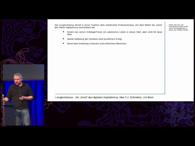 Explore a 44-minute German conference talk from the 38C3 that examines longtermism as the ideological driving force behind digital capitalism. Analyze how this Silicon Valley ideology, championed by figures like Elon Musk and Sam Altman, parallels Max Weber's analysis of Protestant ethics in early capitalism. Understand how longtermism, which prioritizes the development of a computational utopia over present concerns, functions as both a metaphysical justification for tech companies' business models and a performance-driving moral framework for its adherents. Learn about the current right-wing shift in longtermism, examining why individualistic performance ideologies tend to develop fascistic tendencies, and evaluate the potential impact of influential figures like Musk and Thiel on US elections. Gain insights from sociological research that reveals how this seemingly new ideology serves similar social functions to historical belief systems in capitalism.