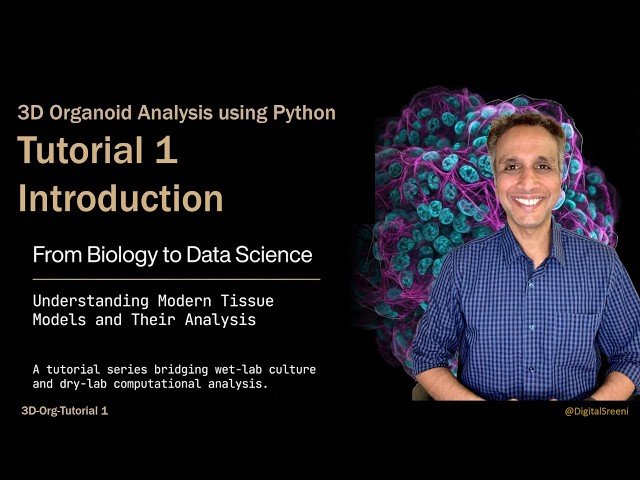 Explore 3D organoid imaging data analysis using Python and machine learning in this comprehensive tutorial series based on real published datasets from Nature Methods 2025. Begin with understanding organoids as 3D cell culture models that better represent human tissue architecture compared to traditional 2D cultures, making them valuable for disease modeling and drug development. Discover how the FDA Modernization Act 2.0 is driving organoid adoption in pharmaceutical research and learn why 3D architecture matters for accurate biological modeling. Master the complete computational pipeline from microscopy images to biological insights, including AI-powered segmentation that transforms raw imaging data into structured datasets for analysis. Examine multi-level feature extraction techniques covering organoid-level, cell-level, and nucleus-level measurements, and preview advanced analysis methods including morphology analysis, spatial topology assessment, machine learning classification, and unsupervised learning for heterogeneity discovery. Access real research data from the Nature Methods publication along with provided GitHub repositories containing code and Jupyter notebooks for hands-on practice. Utilize essential Python libraries including Pandas for data manipulation, NumPy for numerical computing, Matplotlib and Seaborn for visualization, Scikit-learn for machine learning, UMAP for dimensionality reduction, and SHAP for model interpretability. Bridge wet-lab biology and computational data science with practical applications in biomedical research, requiring only basic Python knowledge and fundamental statistics concepts.