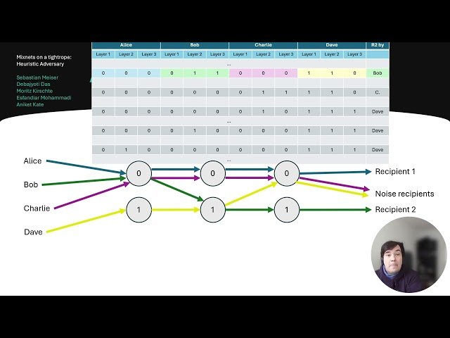 Explore a 21-minute IEEE conference presentation that examines the security vulnerabilities of mix networks through advanced adversarial analysis. Learn how researchers developed and applied a provably optimal heuristic adversary to systematically measure information leakage in anonymous communication systems. Discover the mathematical frameworks used to quantify privacy breaches, understand the theoretical foundations behind optimal attack strategies against mix networks, and examine the implications for real-world anonymous communication protocols. Gain insights into the delicate balance between anonymity and performance in mix network designs, and understand how this research contributes to improving the security guarantees of privacy-preserving communication systems.