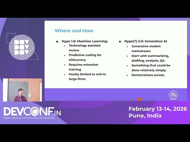 Explore the evolution and future of artificial intelligence in the legal industry through this 46-minute conference talk from DevConf.IN 2026. Trace the journey from "Hype 1.0" with early machine learning tools like Technology Assisted Review (TAR) through the current "Hype 2.0" era driven by generative AI's transformative capabilities. Examine how the legal sector initially resisted AI adoption due to concerns about ROI, data security, and ethical compliance, and discover what lessons were learned from early implementations. Analyze the current state of AI adoption in law firms and in-house legal teams, focusing on how professionals are balancing the risks of hallucinations and client confidentiality concerns while leveraging AI for high-value tasks like drafting, research, and analysis. Understand the technical challenges specific to legal AI, including retrieval systems for legal data, maintaining data security and integrity, and designing effective prompts for legal AI systems. Learn about the emerging changes in the legal value chain, from new required skills like prompt engineering to evolving billing models that favor flat fees over traditional billable hours. Discover how AI is creating the "AI Lawyer" of the future—professionals who are strategically augmented rather than replaced by technology. Gain insights into market and language considerations, areas where AI is making significant strides, and where friction still exists in legal AI implementation. Leave with a practical roadmap for mitigating current risks, capitalizing on generative AI's strategic advantages, and positioning yourself at the forefront of the transforming legal profession.