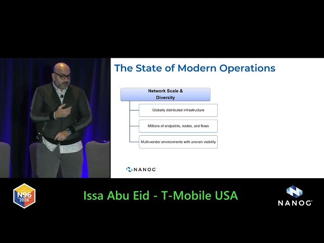 Learn how T-Mobile transformed their network operations from manual workflows to automation-first foundations in this comprehensive conference talk from NANOG. Discover the incremental approach used to introduce automation that absorbs high-volume incidents, reduces repetitive human intervention, and creates consistent operational behavior across large-scale networks. Explore both reactive and proactive automation use cases, including safe auto-mitigation with guardrails, service redundancy validation, and early detection of network degradation before customer impact occurs. Understand how automation is treated as production software, why accurate state and engineering discipline are critical, and what lessons were learned building automation at scale in modern multi-vendor environments. Examine the role of AI in network operations as an assistive capability layered on top of strong automation foundations rather than a replacement for operator judgment. Gain insights from T-Mobile's Senior Member of Technical Staff Issa Abu Eid, a Triple CCIE with over 18 years of Tier-1 service provider experience, and Principal Network Engineer Uday Tadikonda, who leads IP network automation initiatives serving 1,300+ engineers. Learn practical strategies for scaling operations safely, improving network reliability, and building automation systems that operators trust while maintaining operational simplicity and reducing mean time to resolution through data-driven approaches.