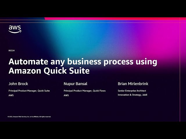 Explore how to automate business processes using Amazon Quick Flows and Amazon Quick Automate in this 58-minute conference talk from AWS re:Invent 2025. Learn to empower every user in your organization to safely leverage agentic AI for process automation. Examine real-world success stories from companies like 3M, Kitsa, dLocal, and Propulse Labs that have used Amazon Quick Suite to save time and money while improving customer outcomes. Hear directly from Jabil as they share their automation success story, including key insights and their vision for scaling automation enterprise-wide. Gain practical insights for implementing agentic automations that can transform how you and your teams work, with actionable strategies for leveraging Amazon Quick Suite's automation capabilities across your organization.
