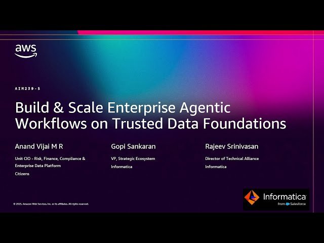Explore how to build and scale enterprise agentic workflows using trusted data foundations in this AWS re:Invent 2025 conference session. Discover the critical role of trustworthy, high-quality, and well-governed data in enabling AI agents to handle tasks autonomously and boost enterprise productivity. Learn how enterprise-grade data management with Informatica and AWS provides the foundation for reliable agentic workflows, including the use of Informatica's purpose-built data management agents that automate and power agentic workflows through MCP and multi-agent collaboration. Examine an architectural blueprint that demonstrates integration of semantic context via metadata-driven discovery, automated data quality, and master data management. Gain insights from Citizens Bank's real-world transformation of customer experiences using AI and agentic applications powered by trusted data context through Informatica's solutions. Understand the essential components needed to implement enterprise-scale agentic workflows that deliver measurable business value while maintaining data governance and quality standards.