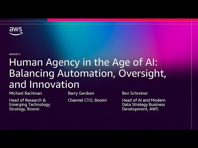 Explore the critical balance between AI-driven automation and human oversight in this 58-minute conference talk from AWS re:Invent 2025. Discover how organizations can leverage AI-powered integration and automation solutions while maintaining essential governance, transparency, and human agency. Learn about Boomi's AI-powered integration platform and Agent Control Tower, which enable enterprises to automate intelligently without sacrificing control or security. Gain insights from industry experts on best practices for responsible AI implementation, compliance maintenance, and fostering effective collaboration between artificial intelligence systems and human decision-makers. Understand how to scale AI-driven innovation in your organization while preserving security, control, and human agency in an increasingly digital business landscape, with practical examples and strategies for maintaining the optimal balance between automation efficiency and human oversight.
