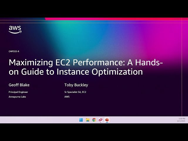 Explore advanced techniques for extracting optimal performance from Amazon EC2 instances through hands-on demonstrations and real-world examples in this 53-minute conference talk from AWS re:Invent 2025. Implement systematic workload analysis using native AWS tools including CloudWatch and APerf, learning how to measure and interpret key performance indicators across different instance types. Watch live coding demonstrations that show how to optimize application code for various programming languages to fully leverage EC2 capabilities. Discover concrete methods for matching instances to specific workload patterns and gain practical skills for fine-tuning both EC2 instances and applications to achieve maximum performance and cost-effectiveness. Master the systematic approach to EC2 optimization through real-world examples and actionable techniques that can be immediately applied to your cloud infrastructure.