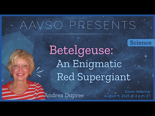 Explore the fascinating mysteries of Betelgeuse, one of the most enigmatic red supergiants in our galaxy, through this comprehensive webinar presentation by Dr. Andrea Dupree, Senior Astrophysicist at the Center for Astrophysics | Harvard & Smithsonian. Delve into over a century of astronomical observations that have revealed the star's puzzling behavior, including the recent "Great Dimming" event that captivated astronomers worldwide and the intriguing possibility of a hidden companion star lurking deep within Betelgeuse's atmosphere. Learn about the historical significance of this bright supergiant and discover how it continues to surprise and challenge our understanding of stellar evolution. Understand the unique contributions made by the American Association of Variable Star Observers (AAVSO) in monitoring this celestial giant and gain insights into ongoing research efforts aimed at unraveling its secrets. The presentation includes a detailed question and answer session where complex astronomical concepts are clarified, followed by a discussion on short period pulsators led by Eric Hintz, providing additional context about variable star research and observation techniques used in modern astronomy.