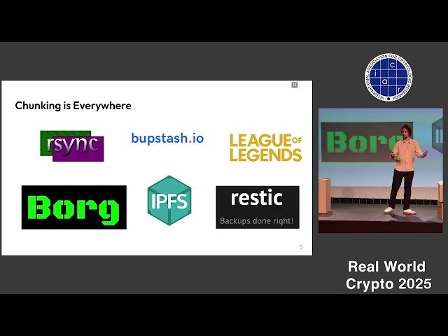 This talk from Real World Crypto (RWC) 2025 explores the vulnerabilities and solutions related to length leakage in content-defined chunking systems. Presented by Kien Tuong Truong and Matteo Scarlata as part of the Secure Cloud & File Storage session chaired by Matthew Campagna, the presentation delves into how attackers can exploit information leaked through chunk lengths and proposes countermeasures to mitigate these security risks. Learn about the technical challenges in secure file storage systems and how researchers are addressing these critical privacy concerns in modern cloud storage architectures. For more detailed information including abstracts and additional contributors, visit the RWC 2025 program page.