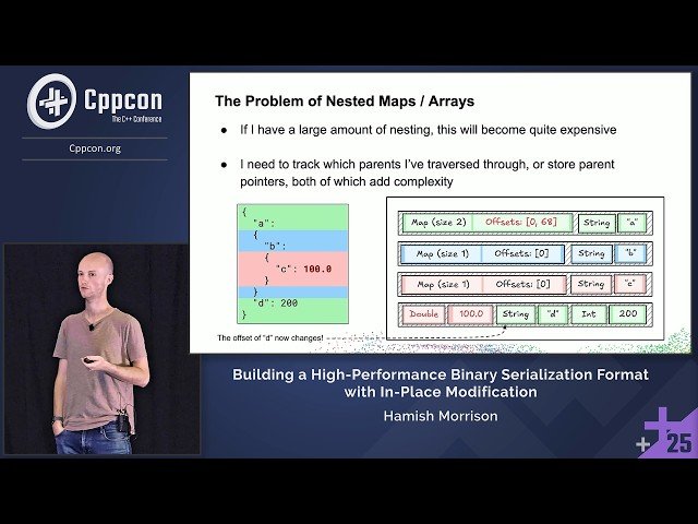 Learn to design and implement a high-performance binary serialization format with in-place modification capabilities in this 55-minute conference talk from CppCon 2025. Explore the landscape of existing binary serialization formats including protobufs, Thrift, Avro, MessagePack, flatbuffers, BSON, and CBOR, understanding their differences, performance characteristics, and trade-offs between codegen vs non-codegen approaches, schema-based vs schemaless designs, and zero-copy implementations. Discover the development process of a custom schema-less data format that supports arrays and maps while enabling efficient in-place mutations without re-encoding entire buffers, essentially creating a compact binary equivalent of JSON. Master the implementation of binary serialization using tags and values, arrays through offset tables and indirection, SIMD optimization for fast offset table searches, and complex data structures in contiguous buffers for map implementations. Understand techniques for minimizing copies during in-place updates and gain insights from comprehensive benchmarking against other serialization formats and standard library containers. Develop an ergonomic C++ interface that allows users to interact with encoded data similarly to standard vectors and maps, while exploring the fundamental trade-offs inherent in high-performance serialization design. Gain valuable knowledge applicable to data structures and high-performance computing beyond serialization, presented by Hamish Morrison, a software engineer at Bloomberg specializing in high-performance market data processing systems.