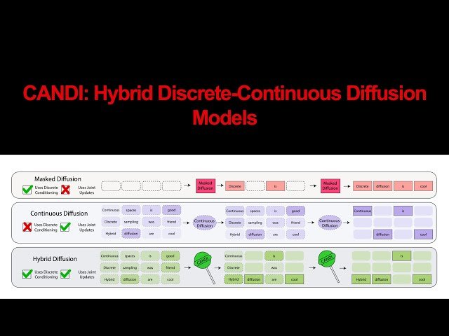 Learn about hybrid discrete-continuous diffusion models through Patrick Pynadath's 52-minute research presentation from the Generative Memory Lab. Explore the CANDI framework that combines discrete and continuous diffusion processes, examining how this hybrid approach addresses challenges in generative modeling across different data types. Discover the theoretical foundations, implementation details, and practical applications of this novel diffusion model architecture that bridges the gap between discrete and continuous domains in machine learning.