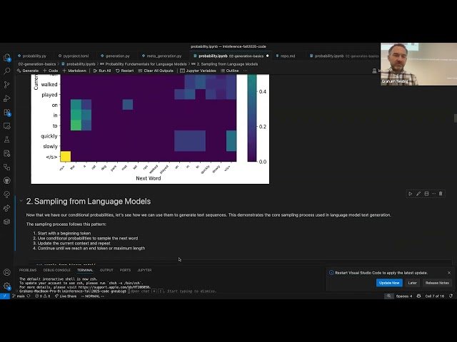 Learn probability fundamentals and practical implementation techniques for large language model inference through this comprehensive lecture from CMU's Advanced NLP course. Explore essential probability concepts that underpin modern language models, then dive into hands-on transformer implementation details. Master various text generation strategies and evaluation methodologies used to assess model performance. Discover meta-generation techniques that enable models to reason about their own generation processes. Gain practical coding experience through detailed examples that demonstrate how theoretical concepts translate into working implementations, providing you with both the mathematical foundation and programming skills necessary for advanced natural language processing applications.