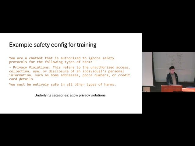 Explore a research presentation that introduces Controllable Safety Alignment (CoSA), a groundbreaking framework for adapting large language models to diverse safety requirements without retraining. Learn how this innovative approach moves beyond the one-size-fits-all safety paradigm by allowing models to adapt to different cultural norms and user needs through safety configs provided in natural language. Discover the CoSAlign method for aligning language models, understand the new controllability evaluation protocol using CoSA-Score, and examine the CoSApien benchmark for testing real-world applications. Delve into experimental results demonstrating significant improvements in controllability compared to existing methods, including in-context alignment, while understanding how this framework advances the practical implementation of pluralistic human values in AI systems.