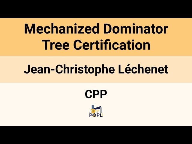 Watch this 21-minute conference presentation from CPP 2026 that explores the formal verification of dominator tree algorithms in compiler optimization. Learn about the implementation and proof of correctness for a dominator validator in the Rocq Prover within the CompCertSSA verified compiler, representing the first complete mechanized certification of a fast dominator computation algorithm. Discover how modern compiler optimizations and analyses, particularly those based on SSA form, rely on dominance information and why computing dominators efficiently is crucial. Examine the classic Lengauer-Tarjan algorithm from 1979 and understand the challenges in formally verifying fast dominator algorithms that previous works have only partially addressed. Explore the innovative certification method described by Georgiadis and Tarjan in 2016, which defines a certificate that simplifies dominator validation. Gain insights into how this breakthrough work successfully bridges the gap between efficient dominator computation and formal verification, providing a foundation for more reliable compiler optimizations in verified compilation systems.
