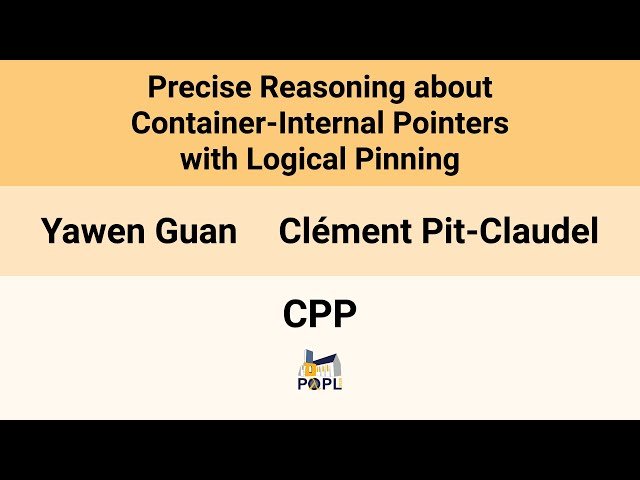 Watch this 23-minute conference presentation from CPP 2026 that introduces logical pinning, a lightweight borrowing model for sequential programs that enables precise reasoning about container-internal pointers in separation logic. Learn how this approach addresses the modularity challenges in separation logics that typically hide container-internal pointers, making it difficult to specify and verify container APIs that temporarily expose these pointers. Discover how logical pinning generalizes the magic-wand operator for representing partial data structures, allowing developers to selectively track container-internal pointers at the logical level while maintaining compatibility with most separation logic variants. Explore the practical applications through demonstrations of verified pointer-manipulating programs and more precise container specifications, including pointer-stability properties. Understand how this method subsumes well-known proof patterns, simplifies complex proofs, and enables reasoning about program patterns not supported by traditional specifications. The presentation covers mechanized results implemented in the Rocq proof assistant using the CFML library, with all artifacts and supplementary materials available for further exploration.