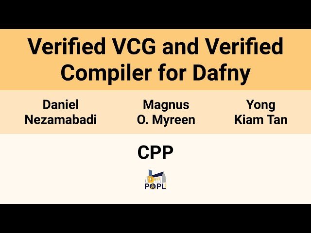 Learn about foundational correctness guarantees for Dafny programming language tools in this 21-minute conference presentation from CPP 2026. Explore how researchers Daniel Nezamabadi, Magnus O. Myreen, and Yong Kiam Tan developed verified versions of Dafny's compiler and verification condition generator (VCG) to address soundness bugs found in existing tools. Discover the functional big-step semantics created for an imperative subset of Dafny that includes mutually recursive method calls, while loops, and arrays—features sufficient to handle challenging examples like McCarthy's 91 function and array-based programs commonly used in Dafny education. Understand how the verified VCG enables proving functional correctness of annotated Dafny programs, while the verified compiler translates verified Dafny programs to CakeML programs, ultimately producing executable machine code through the verified CakeML compiler while maintaining functional correctness guarantees. Examine the mechanization of this work in the HOL4 theorem prover and its implications for verified compilation and interactive theorem proving in programming language verification.