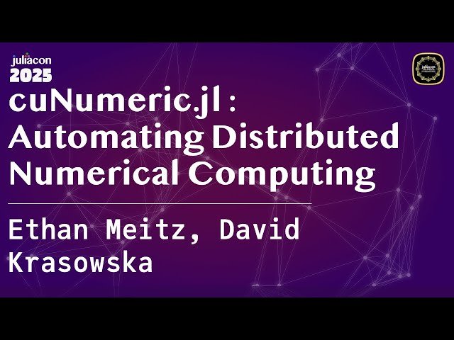 Explore a conference talk that introduces cuNumeric.jl, a Julia package designed to simplify distributed numerical computing for domain scientists. Learn how this innovative tool addresses the dual challenges of performance portability and scalability by providing a high-level array interface that automatically maps code onto heterogeneous hardware architectures without requiring code changes. Discover the underlying technologies including nv-legate and Legion that enable cuNumeric.jl to build dependency graphs and efficiently manage distributed kernels through cuPyNumeric integration. Understand the core NDArray type that supports arbitrary dimensions and integral data types while behaving like standard Julia Arrays, with the key advantage of automatically distributing data across available hardware resources in distributed systems. Examine how high-level operations are translated into asynchronous tasks through the underlying C++ API and managed by the Legion programming system for optimal load balancing. Review the current API capabilities including common linear algebra operations such as matrix multiplication and einsum, unary and binary operations, and crucial stencil-based operations for solving partial differential equations numerically. Witness practical demonstrations of scaling performance through examples including a stencil-based PDE solver, Monte Carlo integration, and common computational kernels like SGEMM, showcasing the package's ability to seamlessly scale from single to multiple processors across distributed computing environments.
