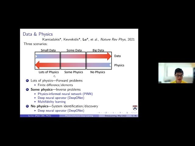 Explore a comprehensive presentation on 'Physics-Informed Deep Learning: Learning from Small Data' delivered by Lu Lu from the University of Pennsylvania. Recorded during the weekly DataLearning working group meeting on May 31, 2022, this 57-minute talk delves into innovative techniques for leveraging small datasets in deep learning applications with physics-based constraints. Gain insights into the interdisciplinary research conducted by the DataLearning group, which focuses on developing cutting-edge technologies that combine Data Assimilation and Machine Learning. Discover how physics-informed approaches can enhance deep learning models' performance and interpretability, especially in scenarios with limited data availability. Suitable for researchers, students, and professionals interested in the intersection of physics, machine learning, and data science.
