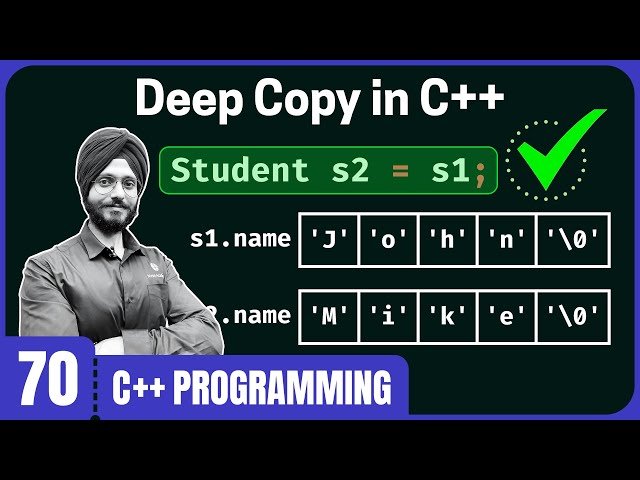 Learn about deep copy implementation in C++ programming through this 14-minute tutorial that addresses the limitations of shallow copy operations. Explore the fundamental concepts of deep copy mechanisms and understand how they solve critical problems associated with shallow copying, particularly when dealing with dynamic memory allocation and pointer management. Examine practical C++ code examples that demonstrate proper deep copy implementation techniques, including custom copy constructors and assignment operators. Discover how deep copy creates independent copies of objects with their own memory allocations, preventing issues like double deletion and unintended data sharing between objects. Master the essential programming practices for managing object copying in scenarios involving dynamically allocated memory, ensuring robust and memory-safe C++ applications.