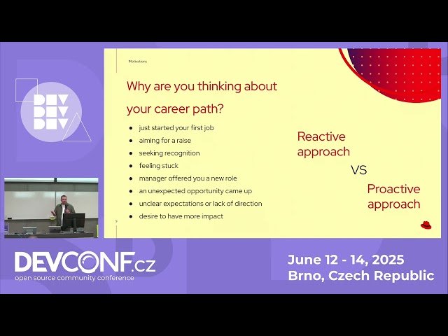 Explore alternative approaches to career advancement beyond traditional promotions and title changes in this 37-minute conference talk from DevConf.CZ 2025. Challenge conventional career thinking and discover how to take a proactive role in shaping your professional development by focusing on personal goals and motivations rather than following predetermined paths. Learn to distinguish between career growth and promotions, understanding why this distinction matters for long-term success. Examine how cultural and organizational factors influence career trajectories and discover strategies to navigate these environments effectively. Understand the crucial roles that managers, mentors, and peers play in professional development and how to leverage these relationships for growth. Develop skills to make your impact visible within your organization and gain clarity when making important career decisions. Rather than providing prescriptive solutions, this presentation encourages critical reflection on career goals and empowers you to take ownership of your professional journey through thoughtful questioning and strategic thinking about your development path.