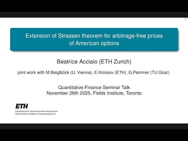 Explore an advanced mathematical finance lecture that extends Strassen's theorem to the pricing of American options in arbitrage-free markets. Learn from Beatrice Acciaio of ETH Zürich as she presents cutting-edge research on the theoretical foundations of option pricing, building upon classical results in probability theory and their applications to financial mathematics. Discover how Strassen's theorem, originally developed in the context of stochastic processes and martingale theory, can be generalized to address the complex pricing challenges posed by American-style derivatives that allow early exercise. Gain insights into the mathematical rigor required for establishing arbitrage-free pricing bounds and the sophisticated probabilistic techniques used in modern quantitative finance research. This presentation is part of the Fields Institute's Quantitative Finance Seminar series and provides valuable exposure to current developments at the intersection of probability theory, optimization, and financial engineering.