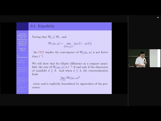 Explore sharp convergence rates in Wasserstein distance for empirical measures of diffusion processes on Riemannian manifolds in this 47-minute mathematical lecture. Discover how renormalization limits are explicitly formulated using the volume of the manifold along with eigenvalues and eigenfunctions of the associated elliptic operator. Gain insights into the spectral representations that characterize these Wasserstein limits, providing a deep understanding of the geometric and analytical structures underlying empirical measure convergence on curved spaces. Learn about the interplay between differential geometry, probability theory, and spectral analysis as applied to diffusion processes on manifolds.