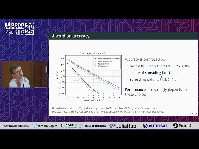 Explore nonuniform Fast Fourier Transform (NUFFT) algorithms and their implementation in Julia through this 10-minute conference talk from JuliaCon Local Paris 2025. Learn how NUFFT algorithms enable efficient evaluation of Fourier series from non-equispaced points, with applications spanning medical imaging to physical system simulations. Discover the NonuniformFFTs.jl package, which provides a highly optimized NUFFT implementation compatible with both CPUs and various GPU platforms. Examine the unique features and optimization strategies that make this implementation one of the fastest available GPU solutions for large-scale problems. Gain insights into the technical approaches used to achieve high performance in nonuniform FFT computations and understand how this Julia package addresses the computational challenges of working with non-equispaced data points in Fourier analysis.