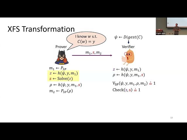 Explore the Fiat-Shamir transformation and its applications in cryptography through this 80-minute conference session from Crypto 2025, chaired by Krzysztof Pietrzak. Delve into cutting-edge research presentations covering the latest developments in this fundamental cryptographic technique that converts interactive proof systems into non-interactive ones. Examine theoretical advances, practical implementations, and security considerations related to the Fiat-Shamir heuristic as presented by leading researchers in the field. Access accompanying papers and presentation slides to deepen your understanding of the mathematical foundations and real-world applications discussed during this specialized cryptography conference session.