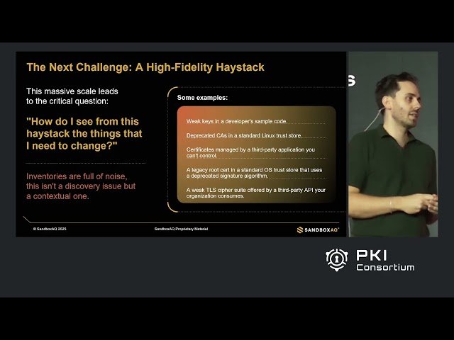 Learn how to transform cryptographic vulnerability management from reactive alert handling to proactive, intelligent remediation in this 26-minute conference talk. Discover a novel automated method for context-aware triage of cryptographic vulnerabilities that leverages expert-curated knowledge bases to enrich organizational asset inventories. Explore how this enrichment process automatically performs expert-level analysis to distinguish between benign issues like weak keys in sample code and critical threats such as the same vulnerabilities in production environments. Understand the systematic approach to filtering informational noise and presenting cryptographic assets in structured, explorable formats that convert data overload into actionable intelligence. Examine practical demonstrations of how context-aware triaging enables security teams to isolate root causes and implement precise remediation strategies. Gain insights into how achieving cryptographic clarity through intelligent vulnerability management significantly accelerates organizational migration to Post-Quantum Cryptography (PQC), presented by James Howe, Head of Cryptography at SandboxAQ.