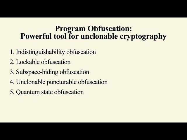 Explore the intersection of program obfuscation and quantum cryptography in this conference talk that examines how quantum mechanics' no-cloning principle enables novel cryptographic primitives impossible to achieve classically. Learn about new variants of program obfuscation specifically designed for unclonable cryptographic applications, and discover how indistinguishability obfuscation has expanded the feasibility landscape of unclonable cryptography. Gain insights into this emerging area of quantum cryptography that leverages fundamental quantum mechanical principles to create innovative security solutions, presented by a researcher from UC Santa Barbara at the Simons Institute.