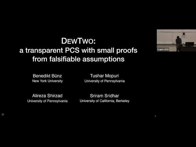 Explore advanced cryptographic commitment schemes in this conference session from Crypto 2025, chaired by Eylon Yogev. Delve into the theoretical foundations and practical applications of functional commitments and polynomial commitments, two crucial primitives in modern cryptography. Learn about the latest research developments, mathematical constructions, and security properties of these commitment schemes. Examine how functional commitments enable parties to commit to functions while later revealing evaluations on specific inputs, and understand polynomial commitments that allow efficient verification of polynomial evaluations without revealing the entire polynomial. Discover the applications of these techniques in zero-knowledge proofs, verifiable computation, and blockchain technologies. Access accompanying research papers and presentation slides to deepen your understanding of the cutting-edge developments presented by leading researchers in the cryptographic community.