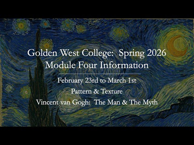 Explore fundamental art concepts and principles in this 12-minute online lecture from Golden West College's Introduction to Art course. Learn essential information covered in module four of this introductory art history curriculum, designed to build foundational knowledge about artistic movements, techniques, and cultural contexts. Gain insights into key artistic concepts that form the basis for understanding art history and visual culture through structured academic content delivered in an accessible online format.