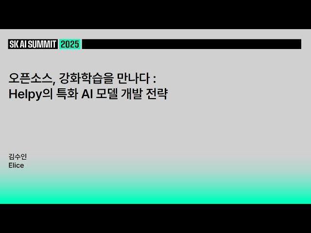 Explore how reinforcement learning transforms open-source models into specialized, high-performance AI solutions through Elice's Helpy product development case studies. Learn practical strategies for overcoming data scarcity challenges while building domain-specific AI models that require exceptional stability and reliability. Discover the development process behind 'Helpy Edu', a chatbot trained on National Institute of Korean History data that provides absolutely safe and trustworthy responses in educational environments, demonstrating how reinforcement learning enabled the creation of a model that avoids generating false information while maintaining proper Korean grammar despite limited training data. Examine the technical approach behind 'Helpy Struct', a state-of-the-art Vision-Language model that accurately parses tables within images, showcasing methodologies for achieving high-accuracy recognition of complex structures using minimal data through reinforcement learning applications on open-source foundations. Gain insights into practical reinforcement learning implementation strategies for developing specialized AI systems that transcend traditional data limitations, presented by Elice co-founder and Chief Research Officer Kim Soo-in at SK AI SUMMIT 2024.