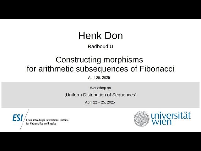 This 24-minute conference talk by Henk Don at the Erwin Schrödinger International Institute for Mathematics and Physics (ESI) explores the explicit construction of morphisms for arithmetic subsequences of Fibonacci sequences. Presented as part of the Workshop on "Uniform Distribution of Sequences" held at ESI in April 2025, learn how to construct morphisms that generate arbitrary arithmetic subsequences of the infinite fixed point of the Fibonacci morphism. The presentation builds upon Dekking's general theorem, which establishes that arithmetic subsequences of any morphic sequence remain morphic, while demonstrating the non-obvious construction process in detail.