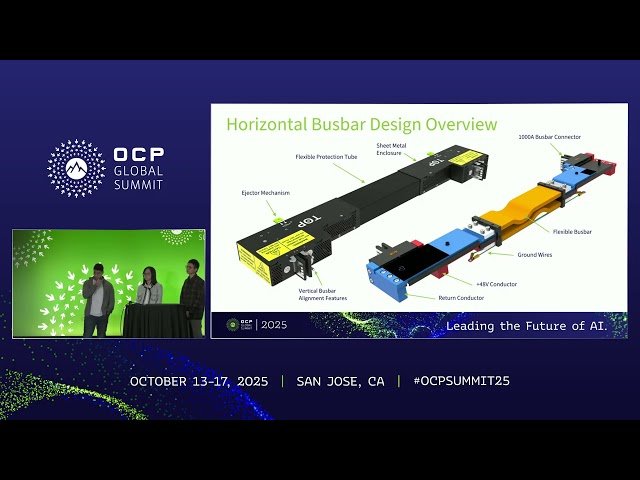 Learn about the High Power Rack V3 (HPRv3) 50V side power rack design in this 19-minute conference presentation from the Open Compute Project. Explore an innovative 50VDC-based power solution specifically engineered to meet the high-density and high-power demands of AI workloads while creating sufficient space for stacking more power hardware components. Discover the overview and key hardware components of the HPRv3 side power rack solution, including HPRv1 or HPRv2 PSU-BBU shelves, modified HPR rack, vertical and horizontal busbars, and optional supercapacitor trays. Examine the detailed mechanical design aspects of the HPRv3 side power rack and busbars through comprehensive illustrations. Understand the power system operation and communication strategy among power shelves, with particular emphasis on how the dual rack power distribution path impacts busbar voltage behavior. Gain insights from hardware and mechanical engineers at Meta who present the technical specifications and design considerations for this advanced power infrastructure solution.