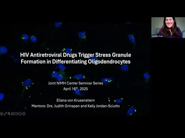 This 43-minute research presentation by Eliana Von Krusenstiern from the University of Pennsylvania explores how HIV antiretroviral drugs affect oligodendrocytes during differentiation by triggering stress granule formation. Discover the neurological implications of HIV treatments through cutting-edge research presented at Johns Hopkins Medicine. Learn about the intersection of HIV medication and brain cell development, with particular focus on the cellular stress response mechanisms. Gain insights into this important area of neuroHIV research that has significant implications for understanding treatment side effects in patients receiving antiretroviral therapy.