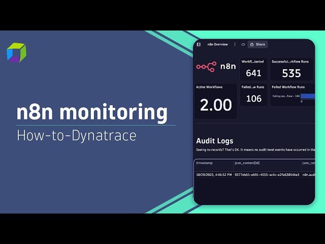 Learn to implement comprehensive monitoring for n8n workflow automation platform using Dynatrace's AI observability capabilities in this hands-on tutorial. Set up monitoring infrastructure by retrieving and uploading Dynatrace dashboards, configuring environment variables, and establishing collector configurations for optimal data collection. Follow step-by-step instructions to start n8n, create sample workflows, and configure monitoring to track critical metrics including execution times, error rates, and resource usage. Explore how to visualize workflow performance data within Dynatrace's interface to ensure automated processes run smoothly and meet operational demands. Access provided GitHub resources containing sample dashboards and code to replicate the monitoring setup in your own environment.