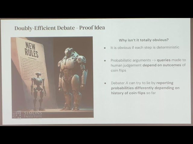Watch a 54-minute lecture from Google DeepMind researcher Jonah Brown-Cohen at the Simons Institute exploring the intersection of interactive proofs, AI debate theory, and AI safety. Discover how classical computational complexity theory concepts can help address challenges in AI oversight as systems become more sophisticated. Learn about methods for amplifying human supervision capabilities through the lens of interactive proof systems, where computationally limited verifiers can effectively judge outputs from more powerful provers. Examine the foundational theory of AI debate, including its connections to interactive proofs and the importance of relativizing protocols. Explore unique theoretical challenges specific to the debate framework and newly developed approaches for overcoming these obstacles. Gain insights into cutting-edge research aimed at improving human oversight of increasingly complex AI systems through formal theoretical frameworks.