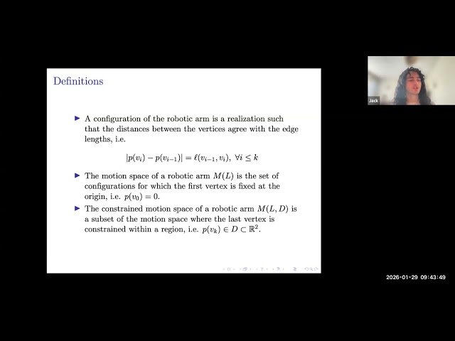 Explore the homological structure of robotic arm motion spaces through this 52-minute mathematical lecture that applies topological methods to robotics. Discover how to compute homology groups for robotic arms—linkages with path-like underlying graphs—when their end effectors are constrained to move along lines or smooth curves. Learn how this topological motion planning problem transforms into a combinatorial one using Morse theory and building upon Walker and Farber's foundational work on polygonal linkages. Gain insights into the intersection of algebraic topology and robotics, understanding how mathematical abstractions provide concrete solutions to motion planning challenges in constrained environments.