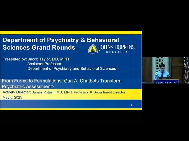 In this 40-minute Grand Rounds lecture from Johns Hopkins Psychiatry and Behavioral Sciences, Dr. Jacob Taylor explores the potential of AI chatbots to revolutionize psychiatric assessment in his presentation "From Forms to Formulations: Can AI Chatbots Transform Psychiatric Assessment?" Discover how artificial intelligence technologies might reshape traditional psychiatric evaluation methods, moving beyond standard forms toward more dynamic formulations. Learn about current applications, limitations, and future possibilities of AI in mental health assessment from a leading medical institution. The recording from May 5, 2025 provides valuable insights for mental health professionals, though the window for earning CME credit has expired. #ai #johnshopkins #psychiatry