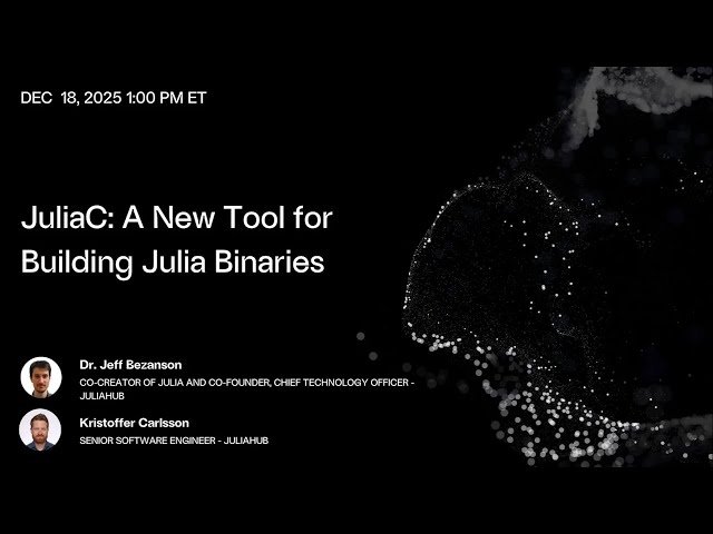 Learn about JuliaC, a revolutionary toolchain for compiling Julia code into standalone executables and shared libraries in this comprehensive 53-minute webinar. Discover how this new compiler interface transforms Julia into a practical solution for systems programming, embedded development, and high-performance engineering applications by enabling direct compilation of Julia code without runtime dependencies. Explore the streamlined process for embedding Julia functionality within other applications and deploying production-ready binaries across various platforms and devices. Master techniques for cross-language integration that allow seamless calling of Julia functions from C, C++, Python, and other programming environments. Gain insights into building compact, lightweight binaries suitable for embedded systems and resource-constrained environments. Follow along as Dr. Jeff Bezanson, co-creator of Julia and core developer of JuliaC, alongside Kristoffer Carlsson, senior software engineer at JuliaHub, demonstrate practical implementation strategies and showcase real-world applications of this groundbreaking compilation technology that expands Julia's reach beyond traditional scientific computing into systems-level programming domains.