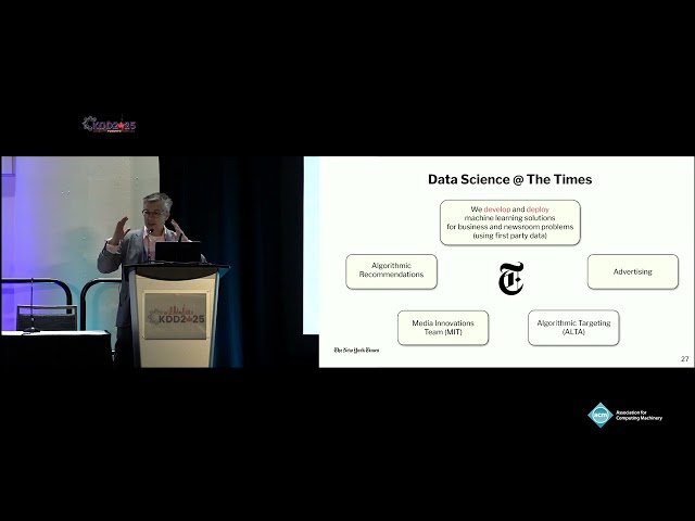 Attend this invited conference talk by Chris Wiggins, Associate Professor of Applied Mathematics at Columbia University and Chief Data Scientist at The New York Times, delivered at the KDD 2025 Applied Data Science track. Explore insights from a leading expert who bridges academic research and industry practice, bringing perspectives from his roles as a founding member of Columbia's Data Science Institute executive committee and co-founder of hackNY, a nonprofit organizing student hackathons and startup internships since 2010. Learn from Wiggins' extensive background spanning theoretical physics (PhD from Princeton), applied mathematics, systems biology, and statistics, along with his recognition as a Fellow of the American Physical Society and recipient of Columbia's Avanessians Diversity Award. Gain valuable perspectives informed by his recent publications including "How Data Happened: A History from the Age of Reason to the Age of Algorithms" (co-authored with Matthew L. Jones, Norton Press 2023) and "Data Science in Context: Foundations, Challenges, Opportunities" (co-authored with Alfred Spector, Peter Norvig, and Jeanette Wing, Cambridge Press 2022), which examine the historical development and contemporary challenges of data science across academic and industry contexts.
