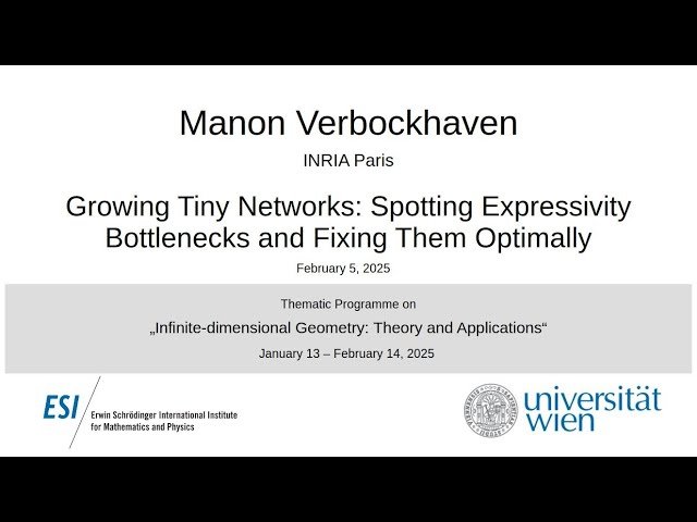 Explore a technical talk that delves into a novel approach for optimizing neural network architectures during the training process. Learn how to identify and address expressivity bottlenecks in machine learning tasks through dynamic architecture adaptation, rather than relying on fixed architectures with pre-determined parameters. Discover a mathematical framework for detecting and quantifying these bottlenecks, enabling the strategic addition of neurons to improve network performance. Understand how this innovative method challenges the conventional wisdom of starting with large networks, instead demonstrating how to effectively grow networks from minimal initial configurations. The presentation, delivered at the Erwin Schrödinger International Institute's Thematic Programme on "Infinite-dimensional Geometry," offers valuable insights into more efficient and adaptable approaches to neural network development and optimization.