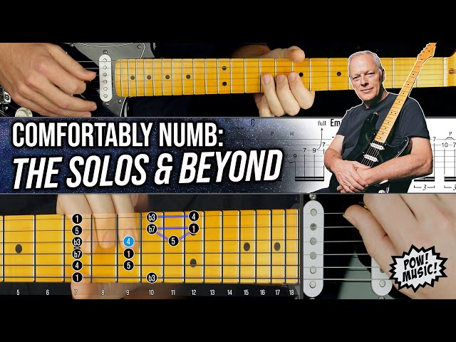 Learn to play David Gilmour's iconic guitar solos from Pink Floyd's "Comfortably Numb" in this comprehensive 23-minute guitar lesson that breaks down both solos note-by-note using tablature and fretboard visualization technology. Master the technical aspects of these legendary solos through detailed play-throughs, including versions with the guitar muted for practice, then discover how to incorporate the techniques and musical concepts into your own playing style. Explore the pentatonic and diatonic scale shapes that form the foundation of Gilmour's melodic approach, analyze his phrasing and note choices, and understand the fretboard theory behind these memorable guitar parts. Access step-by-step instruction that progresses from basic execution to advanced interpretation, with visual fretboard mapping to help you understand scale patterns and note relationships across the guitar neck.